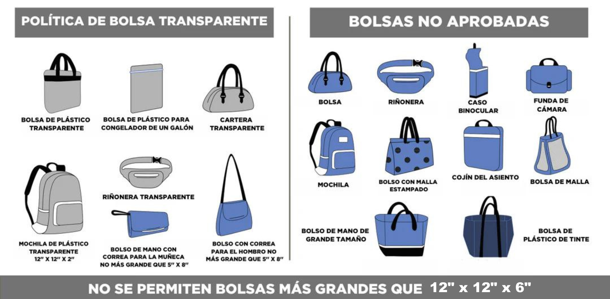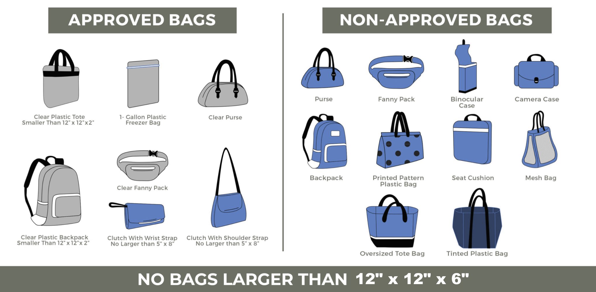 You can bring clear bags that are not larger than 12" x 12" x 6", small purse-like bags that fit in your hand not larger than 4.5" x 6.5", and bags for baby or medical needs if we can check them first.